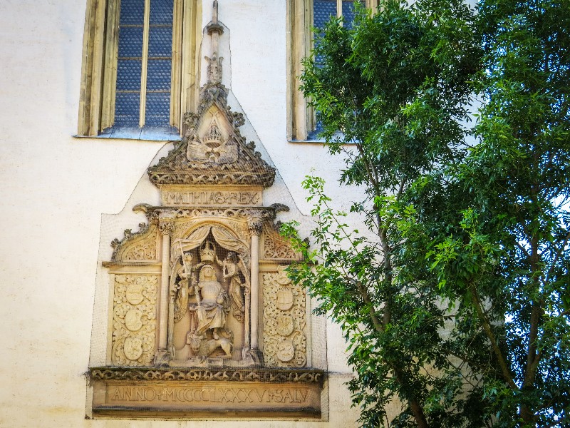 Op de gevel van deze mooie witte toren hangt een beeld van koning Matthias, met wapenschilden van zijn familie en gebieden waarover hij heerste.