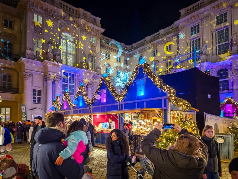 De Wintermarkt op de Schlossplatz bij het Humboldt Forum is super sfeervol door de lichtprojecties op de barokke gevels.
