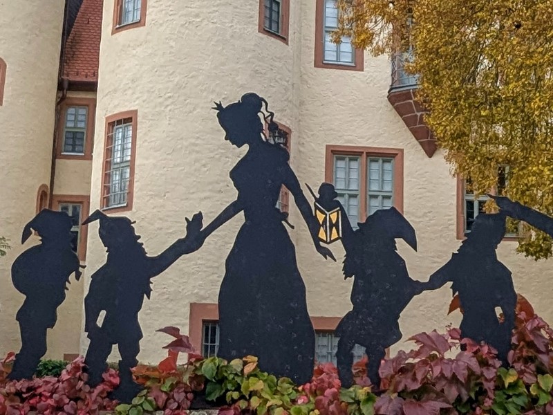 Maar de meest gefotografeerde versie van Sneeuwwitje in Lohr staat voor het kasteel, dat vaker slot (Schloss) genoemd wordt. Hier staat het silhouet, met ook de 7 dwergen.