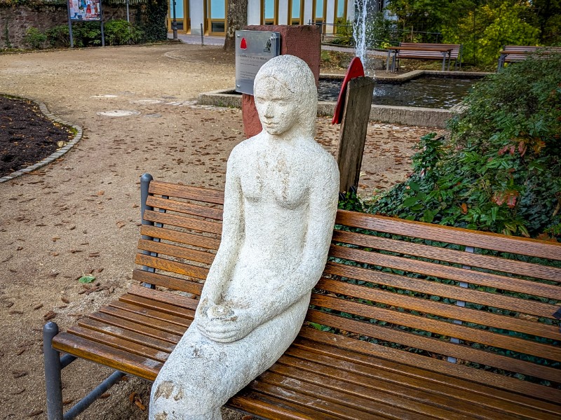 Het meest letterlijke Sneeuwwitje zit op een bankje in het park bij de Zuidelijke stadsmuur. En ik heb ook nog versies gespot in de Haupstrasse, op het oude raadhuis en op de voorbijrijdende stadsbus.